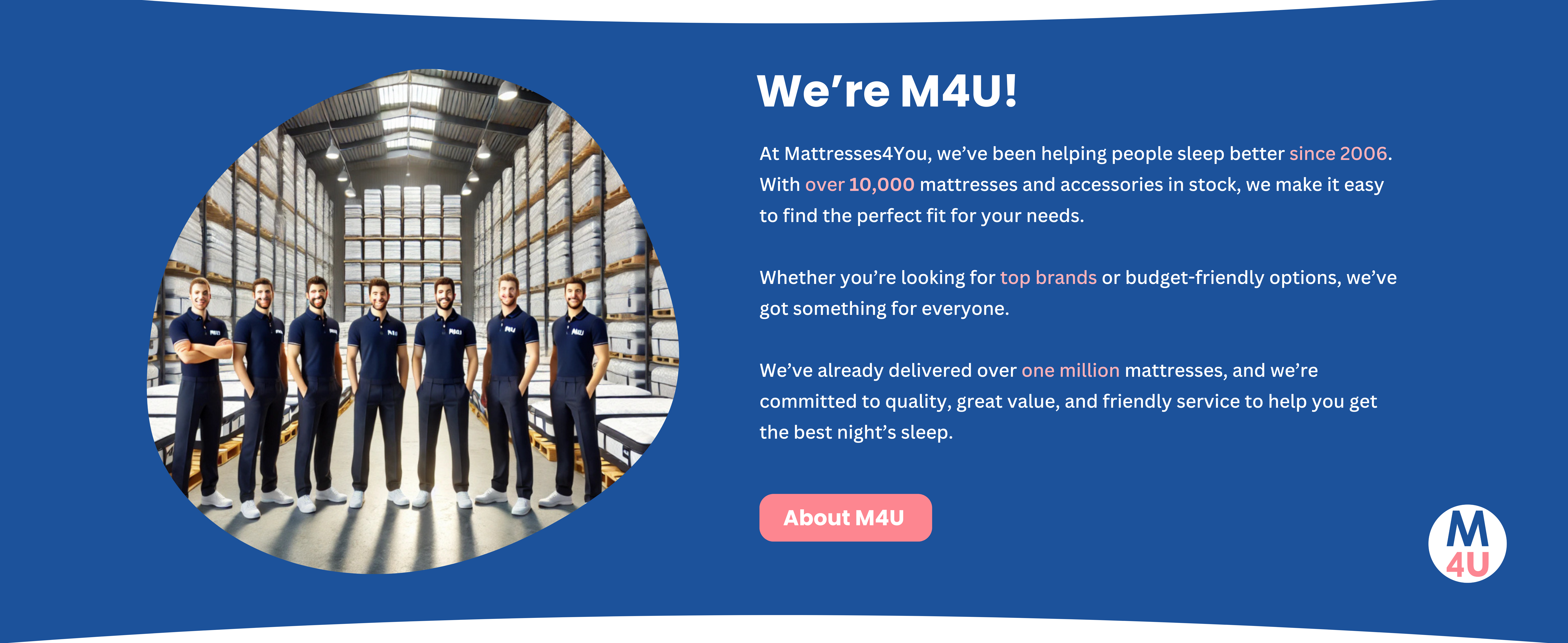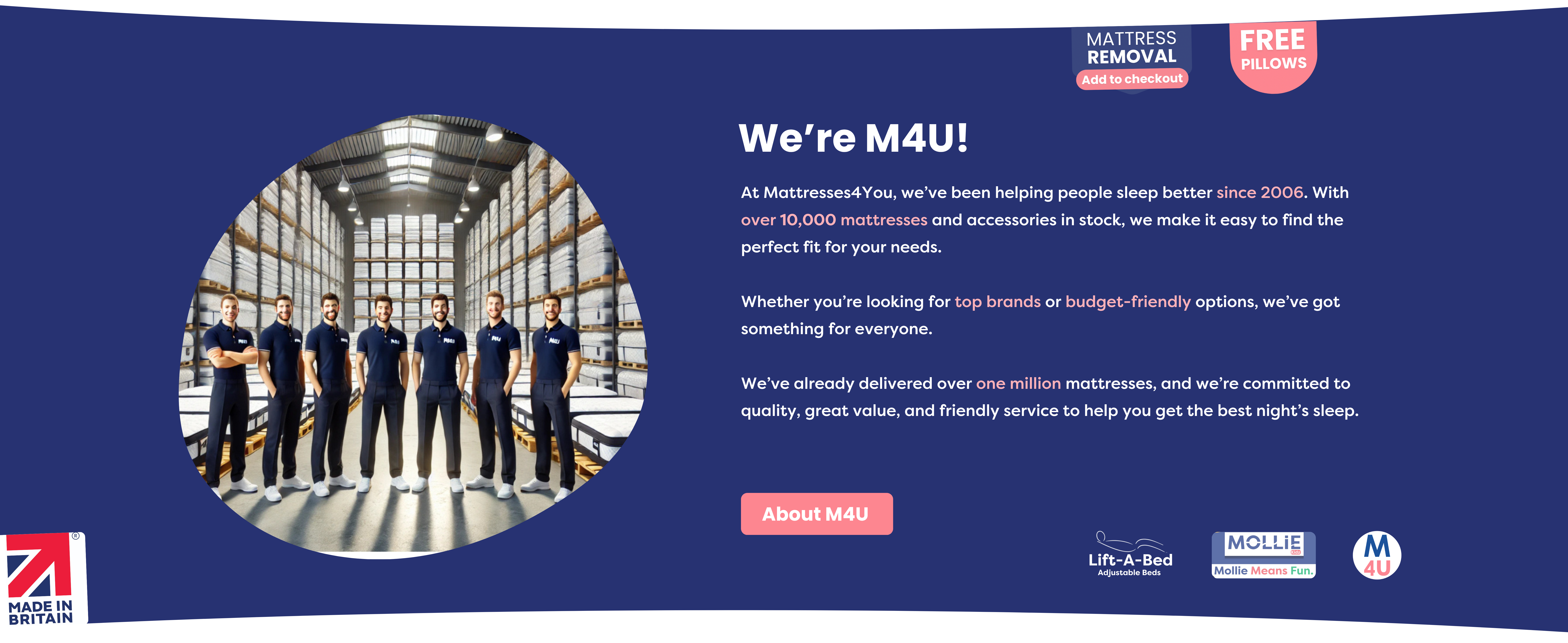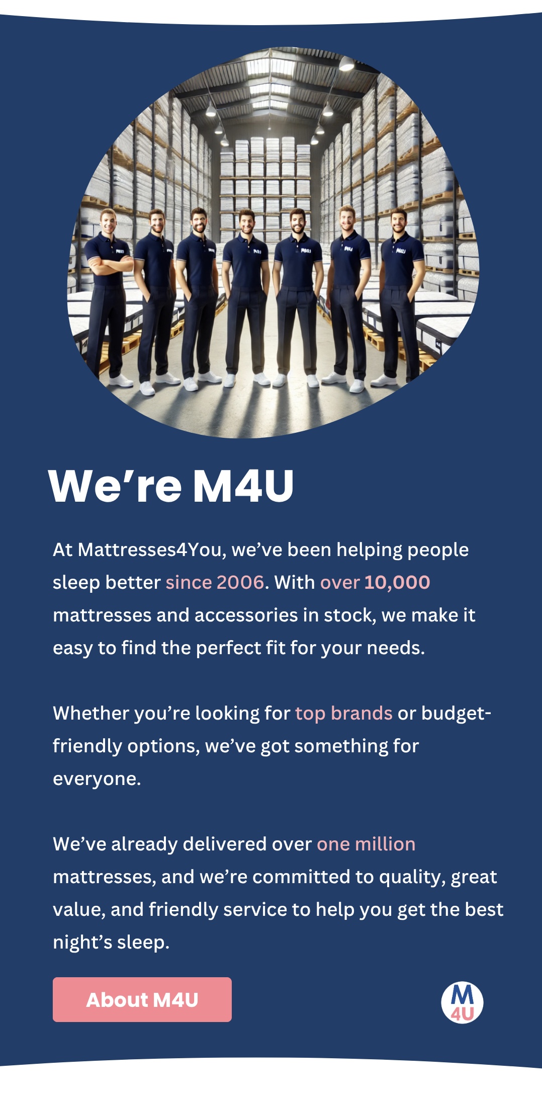My experience with them was lovely!! Adam was great updating me on the process and delivery status. The delivery man was kind and prompt. I simply cannot recommend mattresses4you enough. High praise.